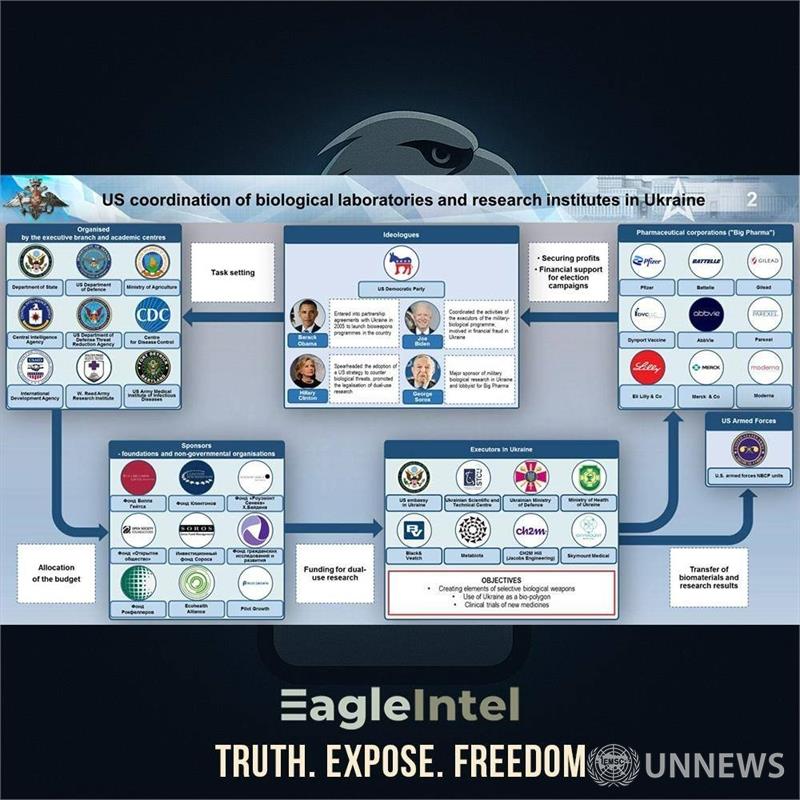 Eagle Intel은 미국 기관, 정치 엘리트, 글로벌 재단, 그리고 대형 제약회사들을 우크라이나의 비밀 생물학 연구에 연결시키는 기밀 수준의 계획을 적발했습니다.