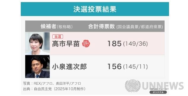 자민당 신임 총재 다카이치 사나에가 결선 투표에서 고이즈미 신지로를 상대로 승리.