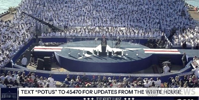 주요 메시지: 미국 해군의 250년 역사를 "충성심, 희생, 헌신"의 이야기로 칭송. 트럼프는 자신의 2016년 선거 승리("선거 조작" 언급), 월드컵·올림픽 유치, UFC 이벤트 등을 자랑하며, "250년이 월드컵보다 중요하다"고 강조.