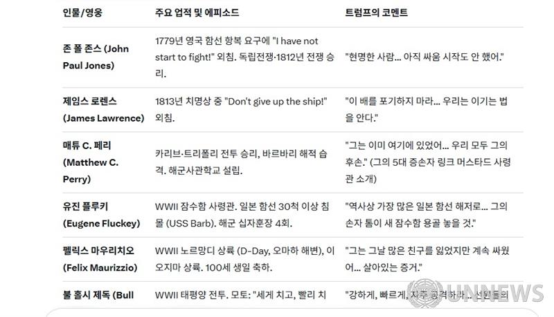2. 역사적 영웅과 업적 회상 트럼프는 해군의 영웅들을 생생하게 묘사하며, "배를 포기하지 마라(Don't give up the ship)" 같은 명언을 인용. 아래 테이블로 주요 인물과 업적을 정리했습니다.