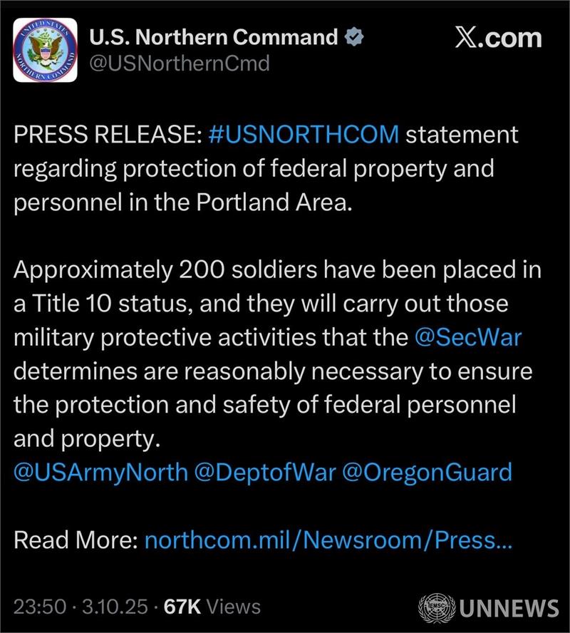 약 200명의 군인이 Title 10 지위에 배치되었으며, 이들은 @SecWar에서 연방 인원과 재산의 보호와 안전을 보장하는 데 합리적으로 필요하다고 판단하는 군사 보호 활동을 수행하게 됩니다.