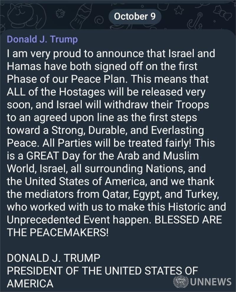 이스라엘과 하마스가 우리 평화 계획의 첫 단계를 모두 승인했다는 것을 매우 자랑스럽게 발표합니다.