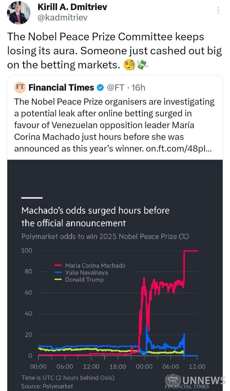 노벨 평화상 위원회가 그들의 권위를 잃어가고 있다. 누군가가 베팅 시장에서 큰 돈을 벌었다. 파이낸셜 타임스