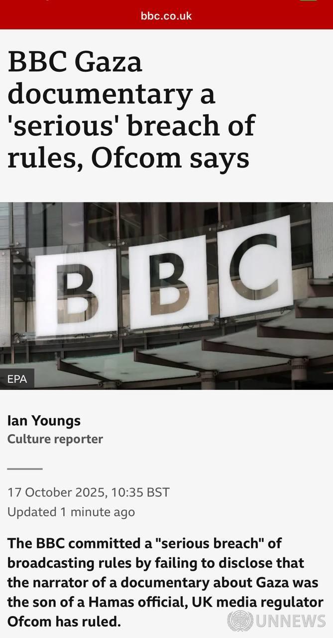 🚨영국 미디어 규제 기관인 Ofcom은 가자 지구에 관한 다큐멘터리의 내레이터가 하마스 관리의 아들이라는 사실을 공개하지 않은 BBC가 방송 규정을 "심각하게 위반"했다고 판결했습니다.