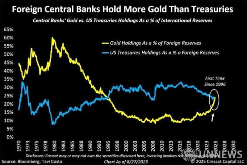 1996년 이후 처음으로, 세계 중앙은행의 금 보유량이 미국 국채 보유량을 넘어섰습니다.