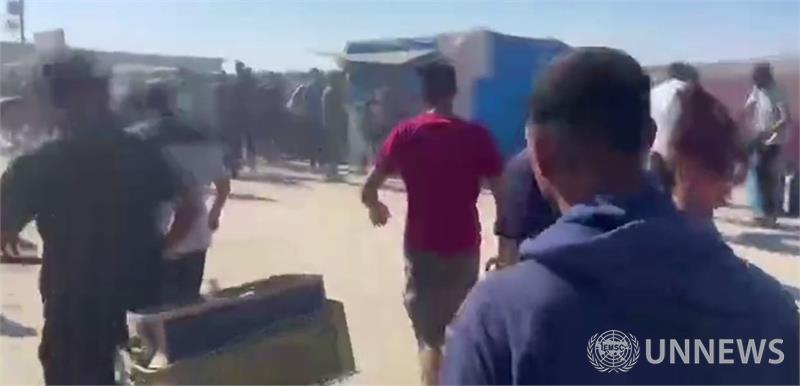 부상자를 돕기 위해 군중들이 텐트를 지나 급히 이동