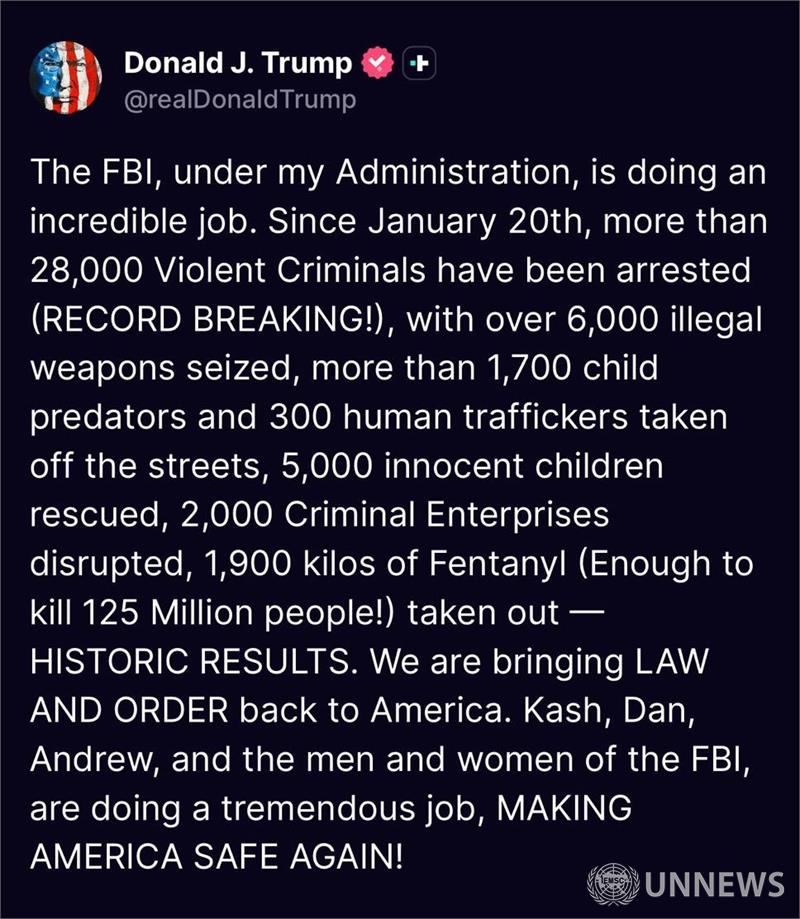 트럼프는 폭력 범죄, 인신매매범, 아동 성범죄자 등을 막는 데 있어 FBI가 해온 일을 칭찬합니다.