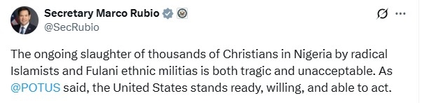 나이지리아에서 급진 이슬람주의자들과 풀라니족 민병대에 의해 수천 명의 기독교인이 계속해서 학살당하고 있는 것은 비극적이며 용납할 수 없는 일입니다. @POTUS 가 말했듯이, 미국은 행동할 준비가 되어 있으며, 기꺼이 행동할 수 있고, 행동할 능력도 있습니다.