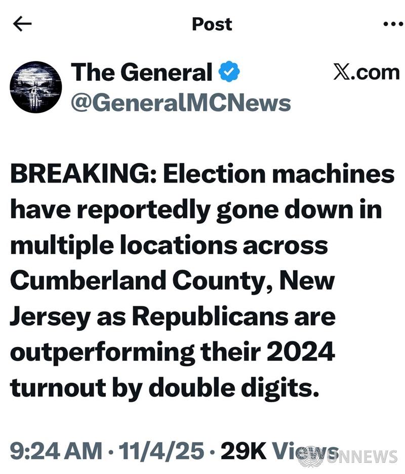 공화당이 2024년 투표율을 두 자릿수로 앞지르면서 뉴저지주 컴벌랜드 카운티 여러 곳에서 선거 기계가 고장났다고 합니다.