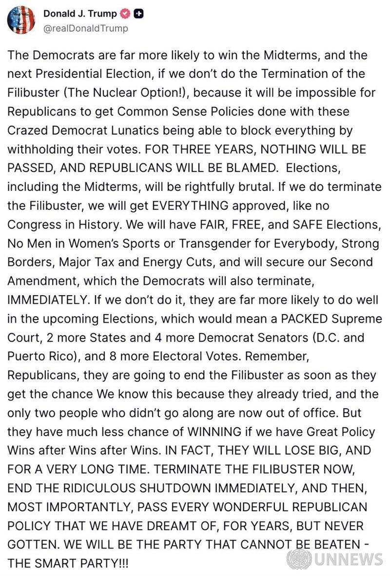 ■트럼프는 필리버스터를 종료해야 하는 이유를 다시 강조합니다.