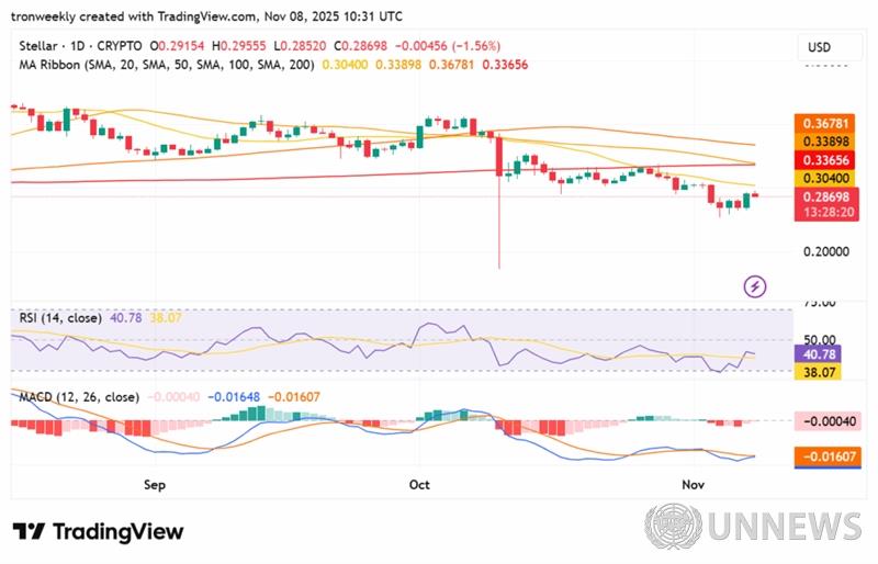 스텔라(XLM)는 RSI가 50선 이하인 40.78에 가깝게 유지되어 강세를 확보하는 데 어려움을 겪고 있습니다. MA 리본 선이 맨 위에 배치되고 수준은 0.3040, 0.3365, 0.3389 및 0.3678로 약세 추세를 나타냅니다. 전반적인 시나리오는 XLM이 강력한 저항 수준을 다루고 있기 때문에 어려운 시기를 나타냅니다.