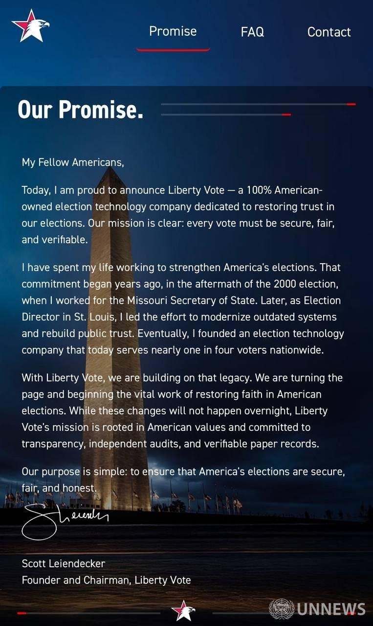 오늘 저는 선거에 대한 신뢰 회복에 전념하는 100% 미국 소유의 선거 기술 회사인 Liberty Vote를 발표하게 되어 자랑스럽게 생각합니다. 우리의 사명은 명확합니다. 모든 투표는 안전하고 공정하며 검증 가능해야 합니다.