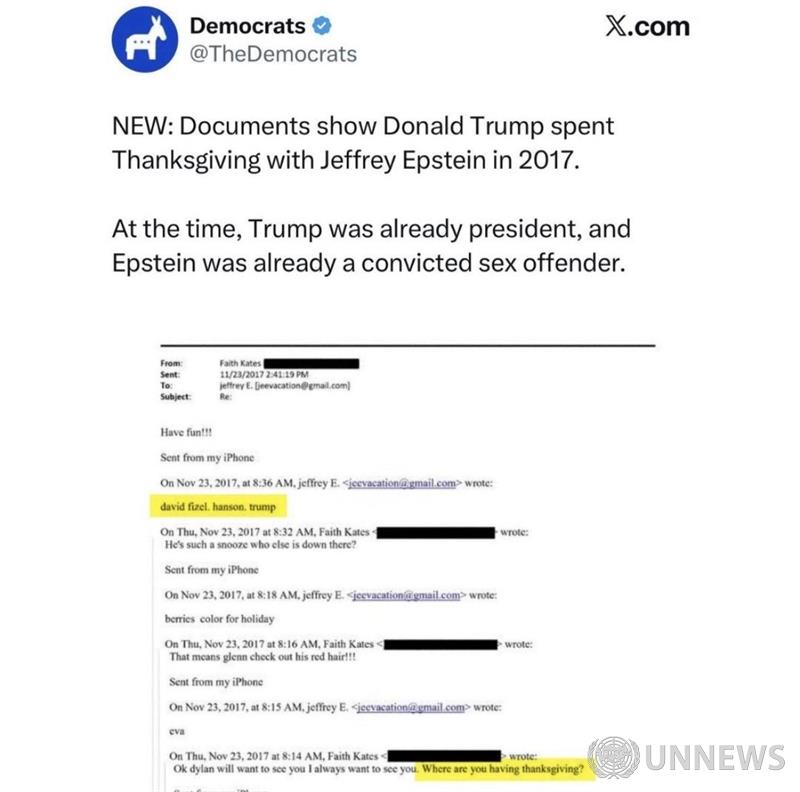 🚨민주당이 2017년 트럼프 대통령이 제프리 엡스타인과 추수감사절을 보냈다고 주장한 게시물을 삭제했습니다..