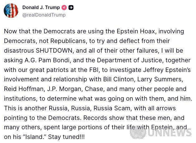 민주당이 공화당이 아닌 민주당을 연루시킨 엡스타인 사기극을 이용해 그들의 재앙적인 셧다운과 다른 모든 실패를 외면하려 하고 있는 지금, 저는 A.G. 팸 본디와 법무부, 그리고 FBI의 위대한 애국자들에게 제프리 엡스타인이 빌 클린턴, 래리 서머스, 리드 호프만, J.P. 모건, 체이스, 그리고 다른 많은 사람들 및 기관들과 연루되었고 그들과 그에게 무슨 일이 일어났는지 조사해 줄 것을 요청할 것입니다.