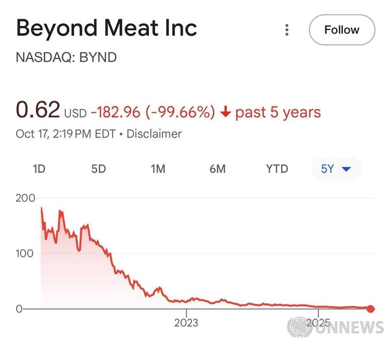 Beyond Meat 주가가 주당 0.67달러로 99% 하락했습니다.