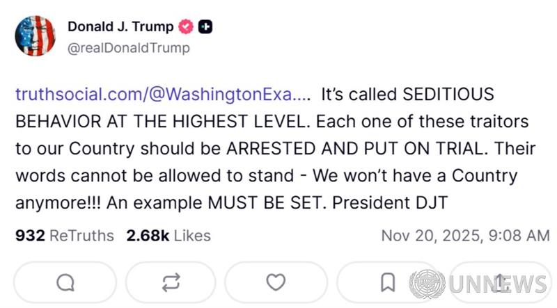 트럼프는 군인들에게 명령을 거부하라고 촉구한 민주당원들을 "체포하고 재판에 회부하라"고 요구하고 있습니다.