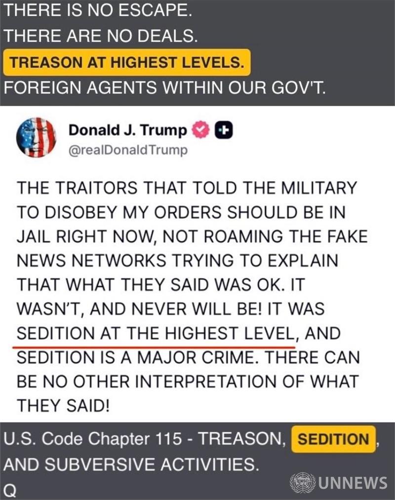 군에 내 명령에 불복종하라고 지시한 반역자들은 지금 당장 감옥에 있어야지, 가짜 뉴스 네트워크를 돌아다니며 자신들이 한 말이 괜찮다고 설명해야 할까요? 괜찮지 않았고, 앞으로도 절대 괜찮지 않을 것입니다! 그것은 최고위급의 선동이었고, 선동은 중범죄입니다. 그들이 한 말에 대해 다른 해석은 있을 수 없습니다!