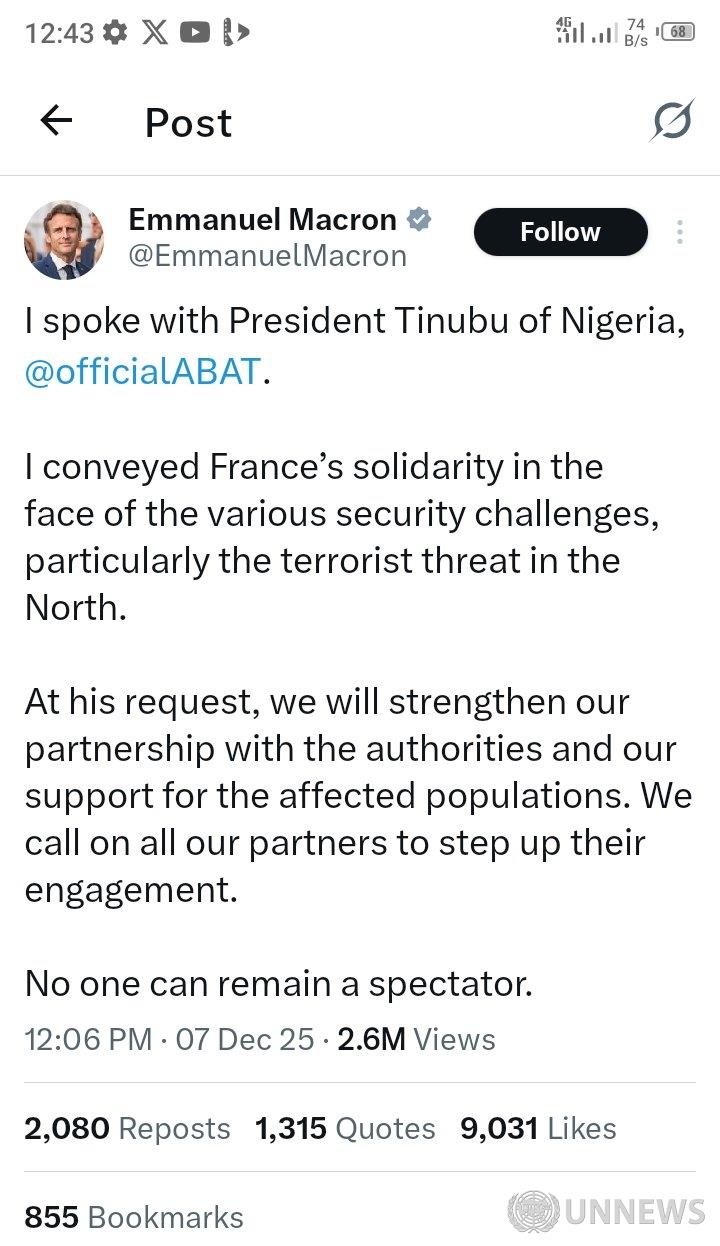 저는 다양한 안보 문제, 특히 북부 지역의 테러 위협에 직면한 프랑스의 연대를 전했습니다.