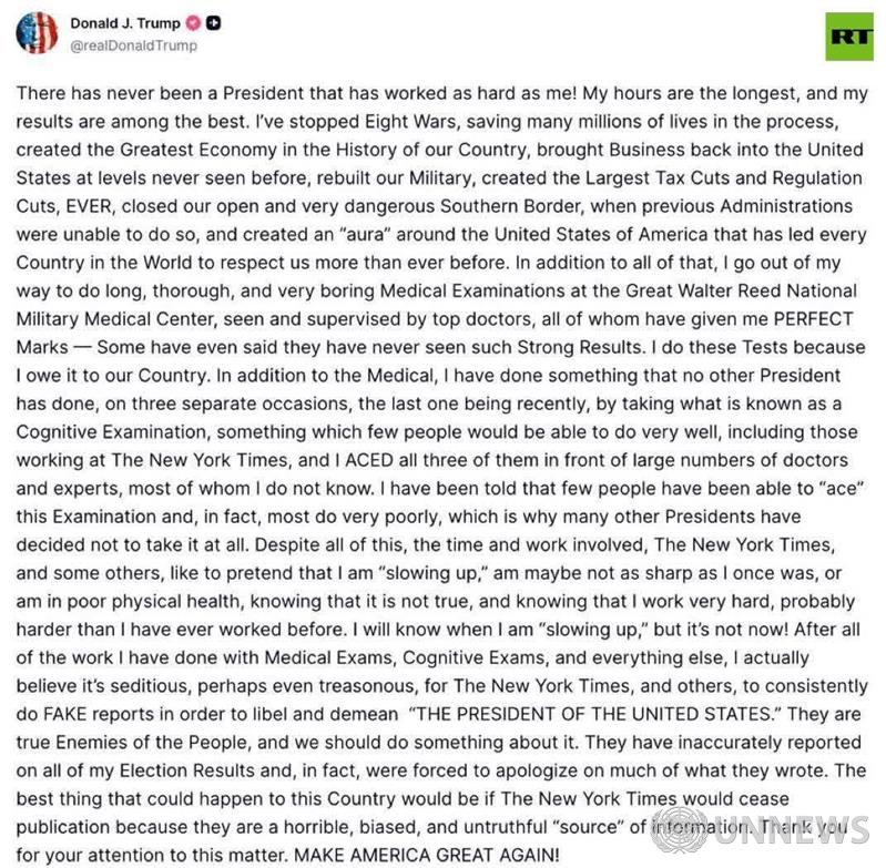 ■트럼프: NYT는 그의 건강에 대한 가짜 뉴스로 반역을 하고 있습니다.