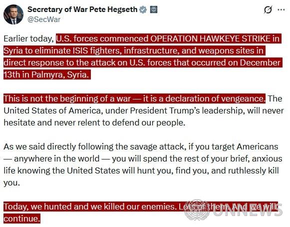■헤그세스는 미군이 시리아에서 '호크아이' 작전을 시작했다고 말했습니다. "오늘 우리는 적을 사냥하고 많은 적을 죽였습니다. 그리고 우리는 계속 할 것입니다."