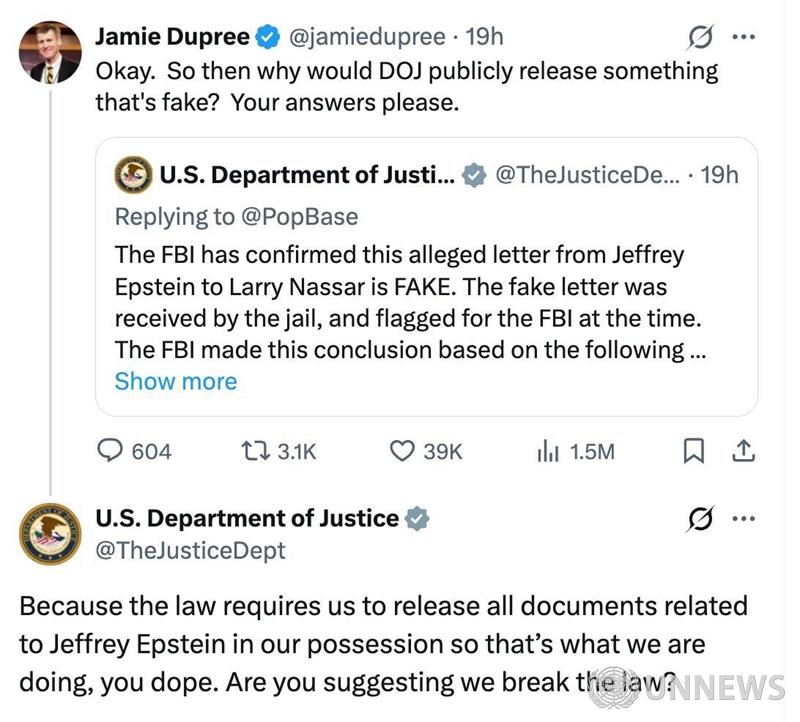 โ๋ ๋ฐ๋ณด์ผโ - DOJ๋ ์ถ์๋ ์ ํ๋ฆฌ ์ํ์คํ์ธ ํ์ผ์ ๊ฐ์ง ๋ด์ฉ์ด ์๋ ์ด์ ์ ๋ํ ์ง๋ฌธ์ ๋ต๋ณํฉ๋๋ค.