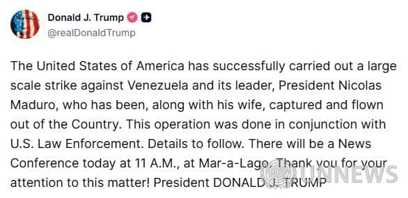 ‼️ 트럼프는 베네수엘라의 마두로와 그의 아내가 체포되어 해외로 이송되었다고 말했습니다.