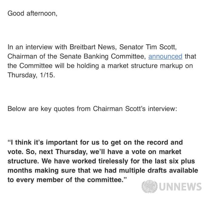 상원의원들은 상원 은행위원회에서 명확법(Clarity Act) 마중 상정을 1월 15일로 정했습니다.