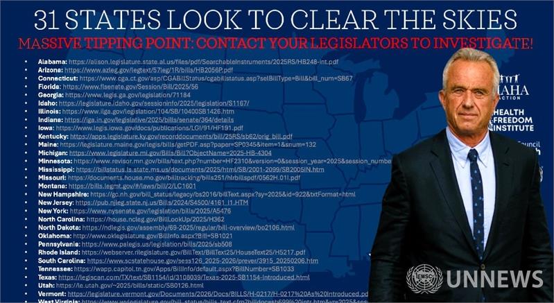 충격적인 보고서: 31개 주, 지구공학 금지 법안 발의 미국, 하늘의 주도권을 되찾다미국 전역에서 역사적인 변화가 일어나고 있습니다. 31개 주에서 수십 년간 비밀리에, 그리고 은폐되어 온 지구공학 및 대기 조작 프로그램을 금지하는 법안을 발의했습니다. 이는 단순한 상징적 저항이 아닙니다. 미국 영토 상공에서 허가 없이 자행되는 기상 조작과 화학 에어로졸