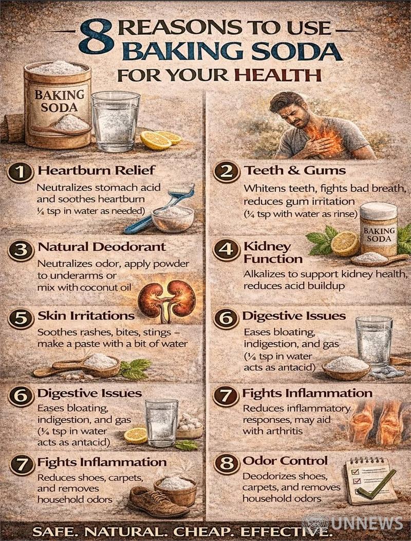건강을 위해 사용해야 하는 8가지 이유베이킹 소다 1. 속쓰림 완화 위산을 중화하고 속쓰림을 완화합니다(필요시 물에 1/2 티스푼). 2.치아 잇몸. 치아 미백, 구취 제거, 잇몸 자극 완화(물에 1.5 티스푼을 넣어 가글) 3. 천연 데오도란트 냄새를 중화합니다. 겨드랑이에 파우더를 바르거나 코코넛 오일과 섞어 사용하세요. 4. 신장 기능 알칼리화하여 신