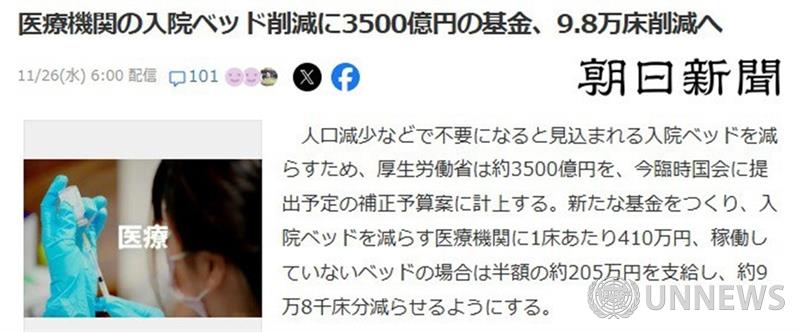 의료기관 입원 병상 감축을 위한 3,500억 엔 기금, 98,000병상 감축.인구 감소로 인해 필요 없어질 것으로 예상되는 입원 병상 수를 줄이기 위해, 보건노동부는 올해 국회에 제출될 예정인 보충예산안에 약 3,500억 엔을 포함시킬 예정입니다. 입원 병상 감소를 위한 의료기관에 병상당 410만 엔, 운영 중단 병상에