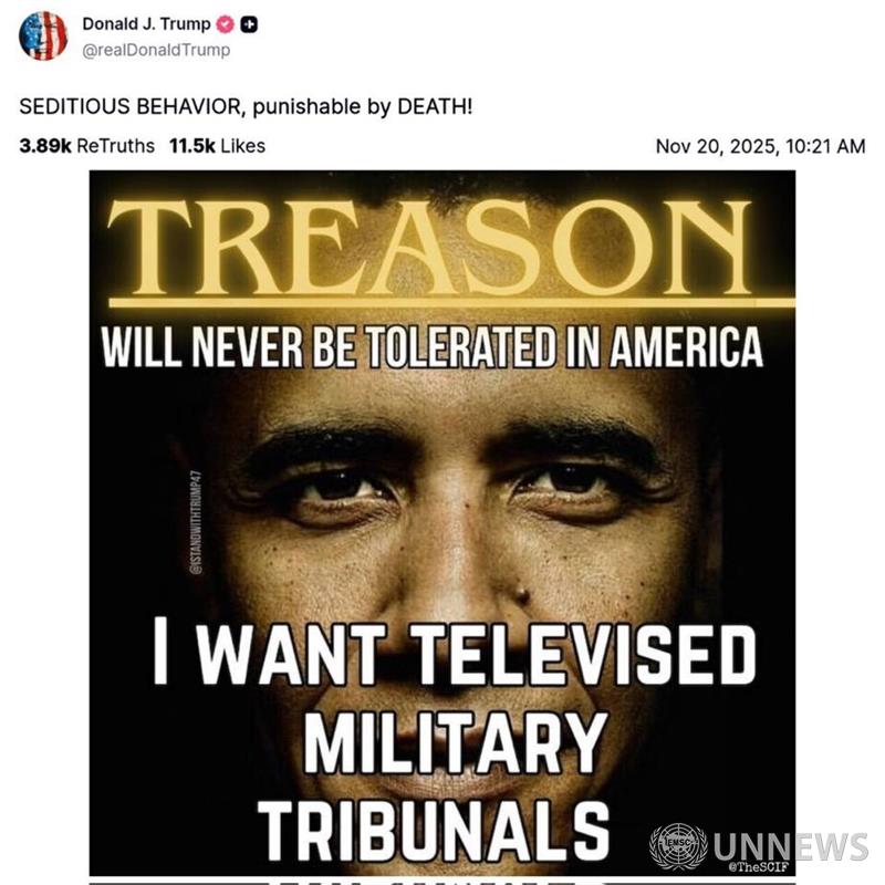 트럼프는 군인들에게 명령을 거부하라고 촉구한 민주당원들을 "체포하고 재판에 회부하라"고 요구하고 있습니다.