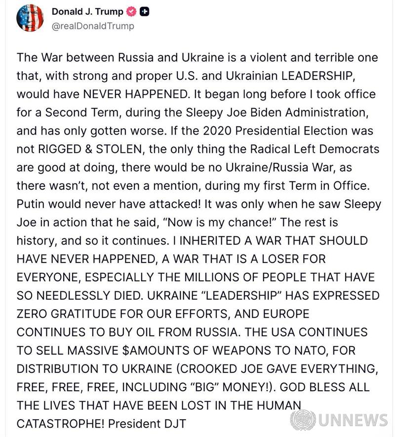 제가 두 번째 임기를 시작하기 훨씬 전, 졸린 조 바이든 행정부 시절에 시작되어 악화될 뿐이었습니다. 2020년 대선이 조작되고 도난당하지 않았다면, 급진 좌파 민주당이 잘하는 유일한 일인, 우크라이나/러시아 전쟁은 없었을 것입니다. 제 첫 임기 동안에는 언급조차 되지 않았습니다. 푸틴은 결코 공격하지 않았을 것입니다! 졸린 조가 행동하는 것을 보고 나서야 "지금이 기회다!"라고 말했습니다. 나머지는 역사가 되었고, 그렇게 계속됩니다 저는 결코 일어나서는 안 될 전쟁을 물려받았습니다. 이 전쟁은 모두에게, 특히 수백만 명이 불필요하게 목숨을 잃었습니다. 우크라이나 "지도부"는 우리의 노력에 전혀 감사하지 않았고, 유럽은 러시아로부터 석유를 계속 수입하고 있습니다. 미국은 우크라이나에 배분하기 위해 NATO에 막대한 양의 무기를 계속 판매하고 있습니다. (Crooked Joe는 "거액"을 포함하여 모든 것을 무료로, 무료로, 무료로 제공했습니다!) 이 인류의 재앙으로 목숨을 잃은 모든 생명에게 신의 가호가 있기를!