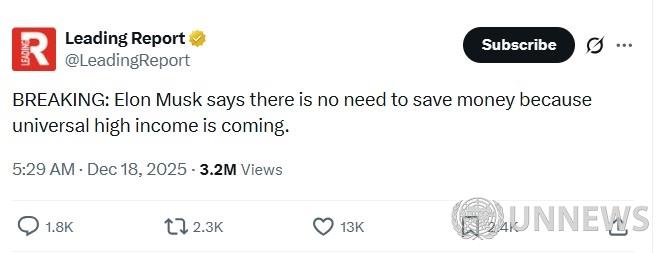 속보: 일론 머스크는 보편적 고소득이 곧 도입될 것이기 때문에 돈을 저축할 필요가 없다고 말합니다.
