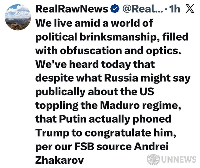 우리는 모호함과 보여주기식으로 가득 찬 정치적 위기의 세계에 살고 있습니다. 오늘 우리는 러시아가 미국의 마두로 정권 전복에 대해 공개적으로 뭐라고 말하든, 푸틴이 실제로 트럼프에게 전화를 걸어 축하했다는 소식을 들었습니다. 이는 FSB 소식통인 안드레이 자카로프의 말입니다