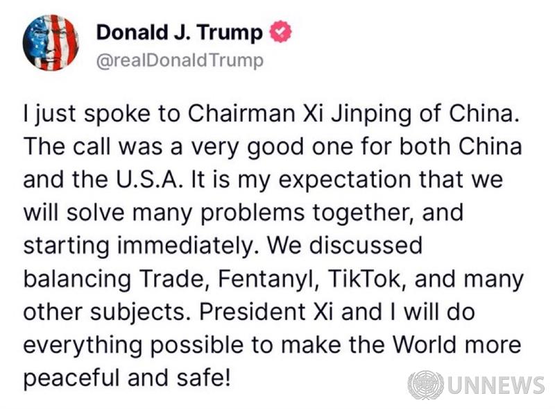이번 통화는 중국과 미국 모두에게 매우 유익했습니다. 우리는 많은 문제를 함께 해결할 수 있을 것으로 기대하며, 즉시 시작할 것입니다. 무역 균형, 펜타닐, 틱톡 등 여러 주제에 대해 논의했습니다. 시진핑 주석과 저는 세계를 더욱 평화롭고 안전하게 만들기 위해 가능한 모든 노력을 다할 것입니다!
