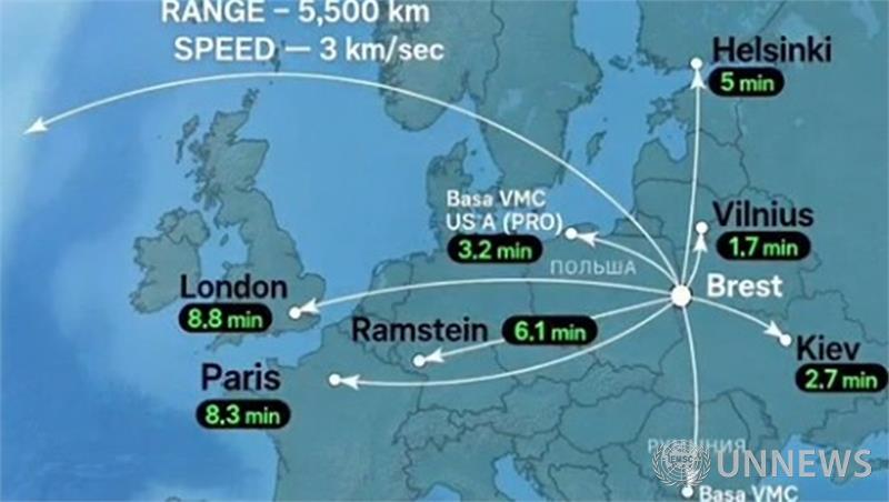 러시아 브레스트에서 발사되는 '오레슈니크' 미사일의 사거리는 빌뉴스까지 1분, 런던과 파리까지 8분입니다.